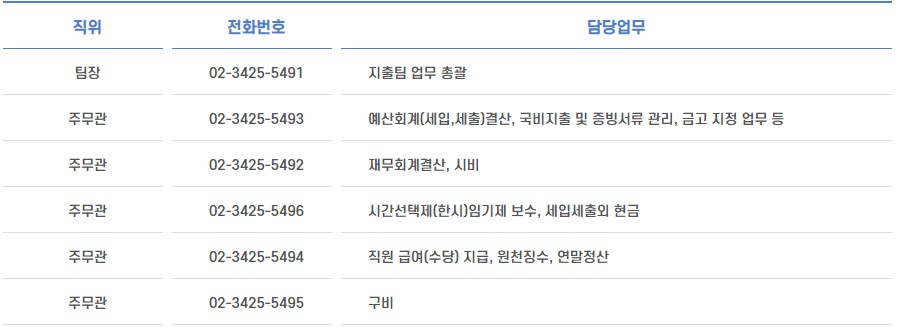 지출팀 업무에 대한 민원이 필요하신 경우 담당자별 전화번호를 남겨드리니 쉽게 확인하시길 바랍니다.