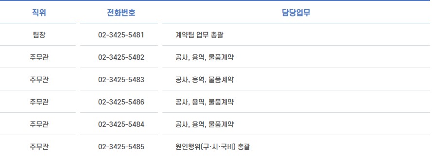 계약팀 업무에 대한 민원이 필요하신 경우 담당자별 전화번호를 남겨드리니 쉽게 확인하시길 바랍니다.