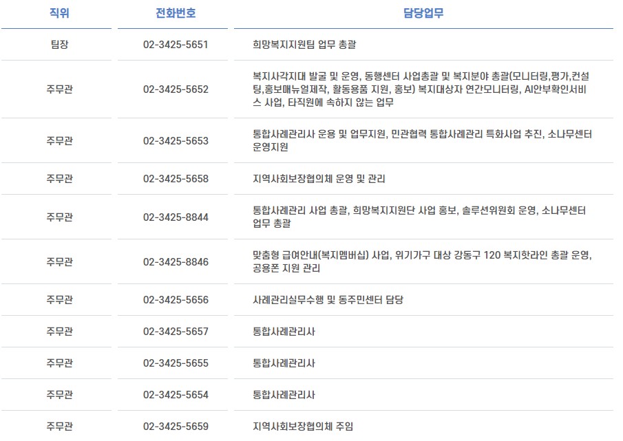 희망복지지원팀 업무에 대한 민원이 필요하신 경우 담당자별 전화번호를 남겨드리니 쉽게 확인하시길 바랍니다.