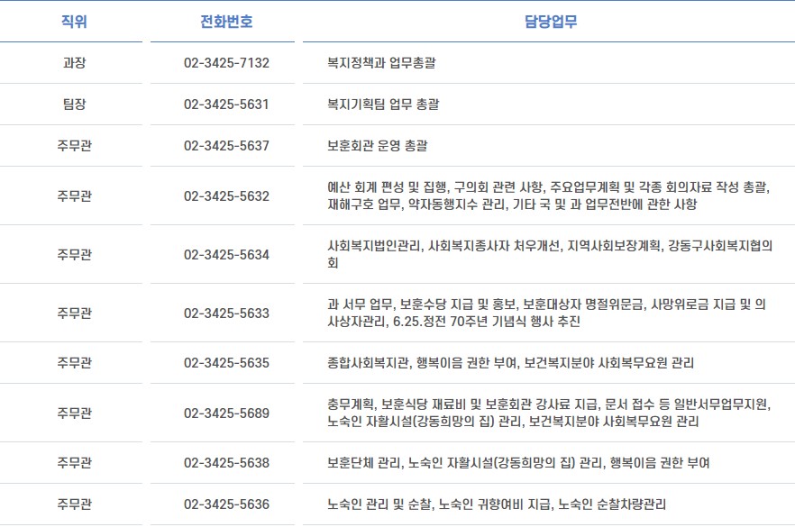 강동구청 복지정책과는 5개의 팀으로 이루어져 나눠서 업무를 담당하고 있으며 각 팀별 업무내용과 전화번호를 아래에 안내 드립니다.