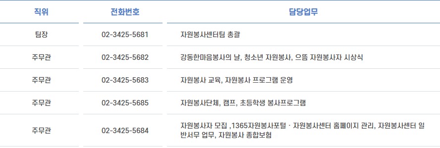 자원봉사센터팀 업무에 대한 민원이 필요하신 경우 담당자별 전화번호를 남겨드리니 쉽게 확인하시길 바랍니다.