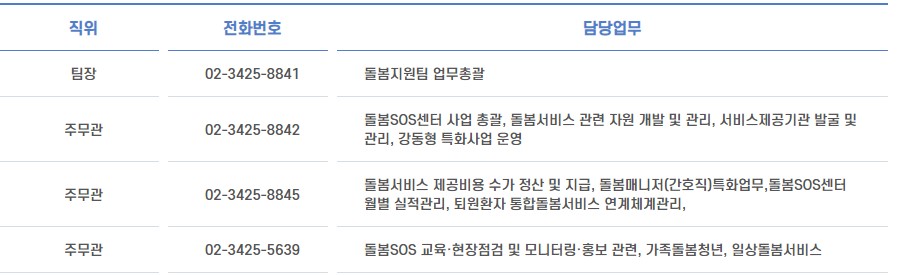 돌봄지원팀 업무에 대한 민원이 필요하신 경우 담당자별 전화번호를 남겨드리니 쉽게 확인하시길 바랍니다.