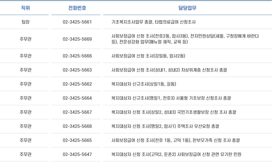 강동구청 생활보장과는 5개의 팀으로 이루어져 나눠서 업무를 담당하고 있으며 각 팀별 업무내용과 전화번호를 아래에 안내 드립니다.