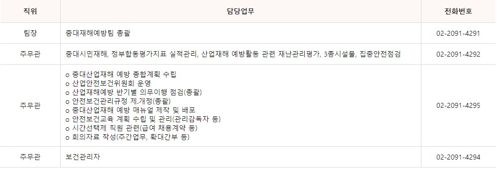 중대재해예방팀 업무에 대한 민원이 필요하신 경우 담당자별 전화번호를 남겨드리니 쉽게 확인하시길 바랍니다.