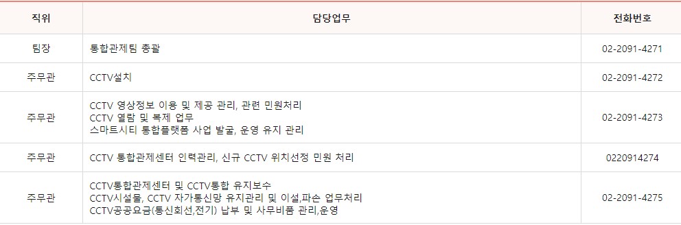 통합관제팀 업무에 대한 민원이 필요하신 경우 담당자별 전화번호를 남겨드리니 쉽게 확인하시길 바랍니다.