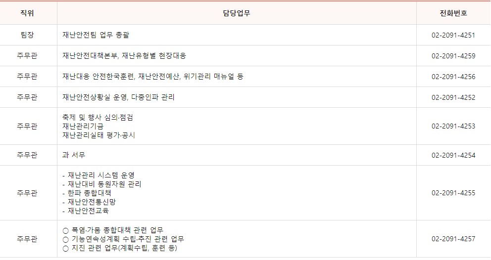 재난안전팀 업무에 대한 민원이 필요하신 경우 담당자별 전화번호를 남겨드리니 쉽게 확인하시길 바랍니다.