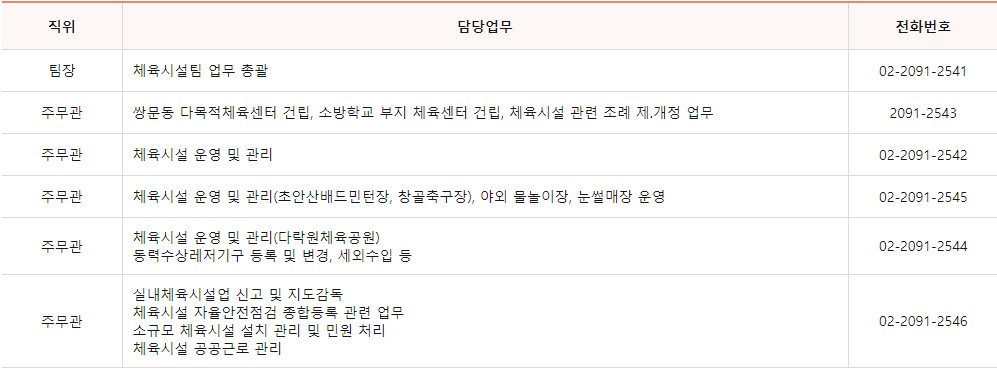 체육시설팀 업무에 대한 민원이 필요하신 경우 담당자별 전화번호를 남겨드리니 쉽게 확인하시길 바랍니다.
