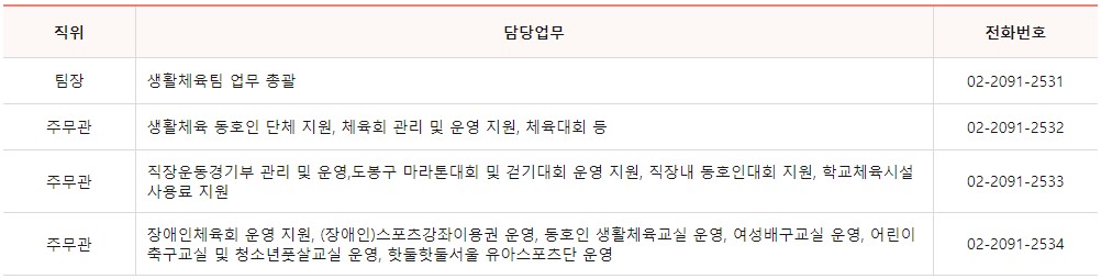 생활체육팀 업무에 대한 민원이 필요하신 경우 담당자별 전화번호를 남겨드리니 쉽게 확인하시길 바랍니다.