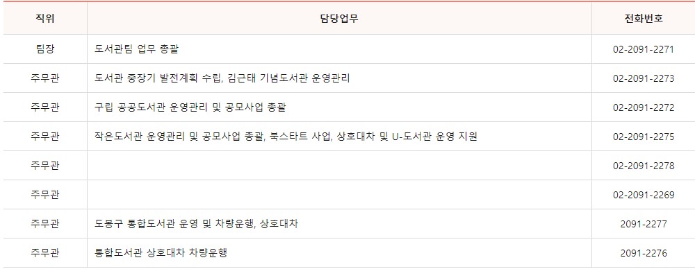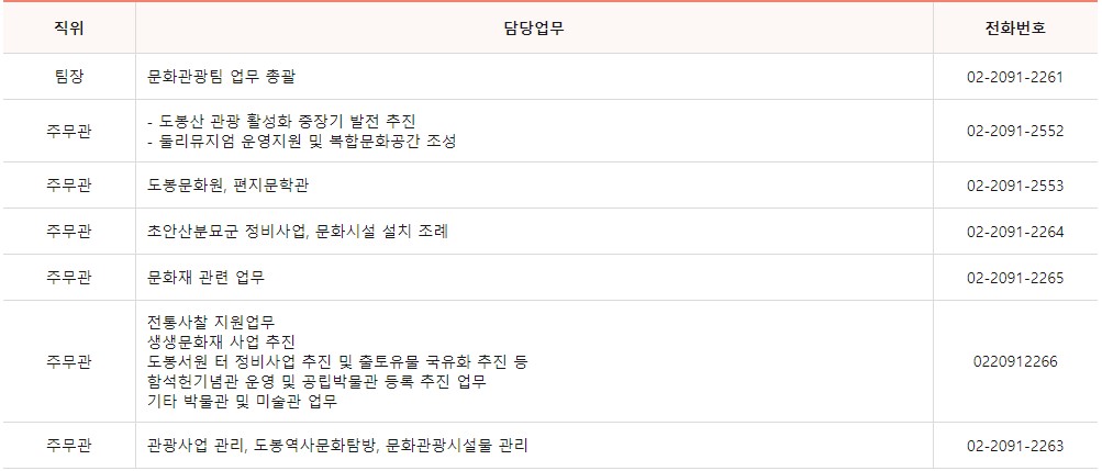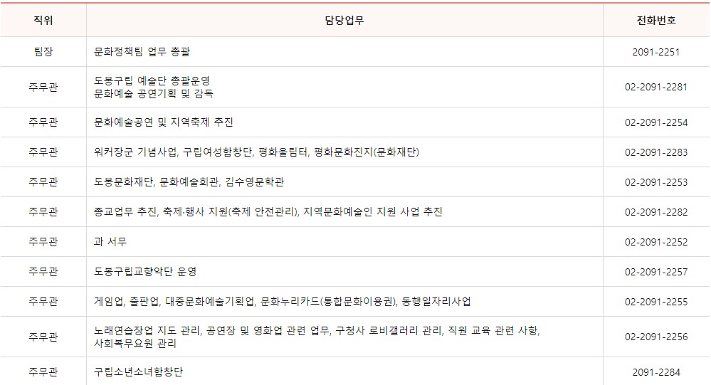 도봉구청 문화체육과는 5개의 팀으로 이루어져 나눠서 업무를 담당하고 있으며 각 팀별 업무내용과 전화번호를 아래에 안내 드립니다.