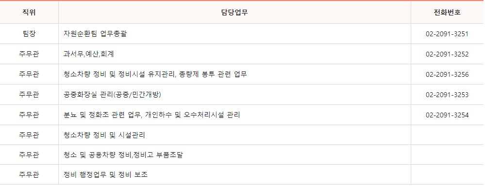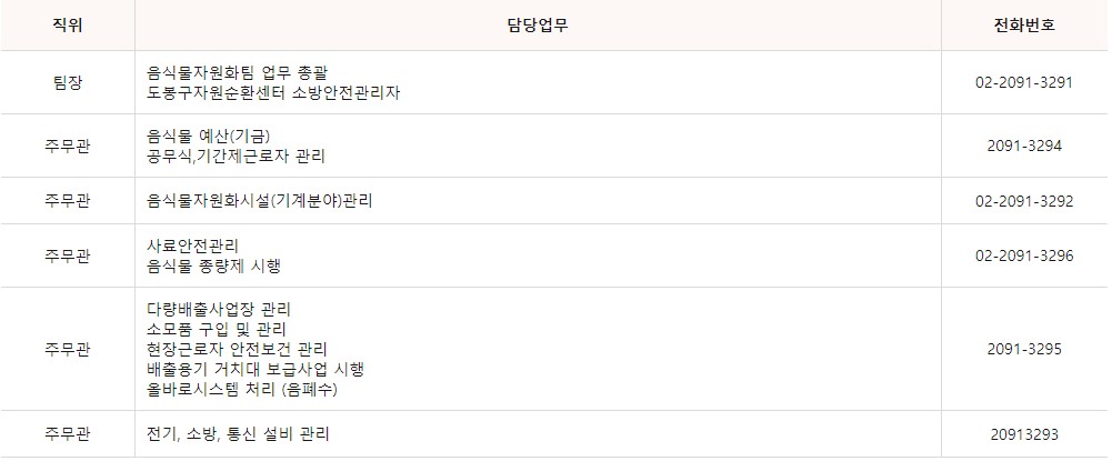 도봉구청 자원순환과는 4개의 팀으로 이루어져 나눠서 업무를 담당하고 있으며 각 팀별 업무내용과 전화번호를 아래에 안내 드립니다.