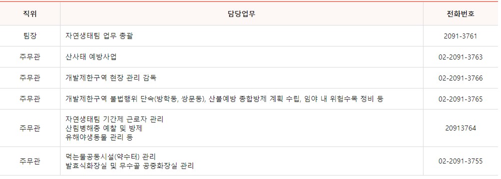 자연생태팀 업무에 대한 민원이 필요하신 경우 담당자별 전화번호를 남겨드리니 쉽게 확인하시길 바랍니다.