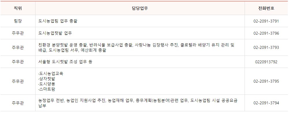 도시농업팀 업무에 대한 민원이 필요하신 경우 담당자별 전화번호를 남겨드리니 쉽게 확인하시길 바랍니다.