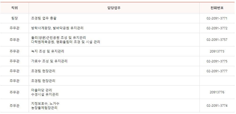 조경팀 업무에 대한 민원이 필요하신 경우 담당자별 전화번호를 남겨드리니 쉽게 확인하시길 바랍니다.