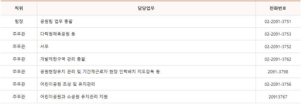 공원팀 업무에 대한 민원이 필요하신 경우 담당자별 전화번호를 남겨드리니 쉽게 확인하시길 바랍니다.