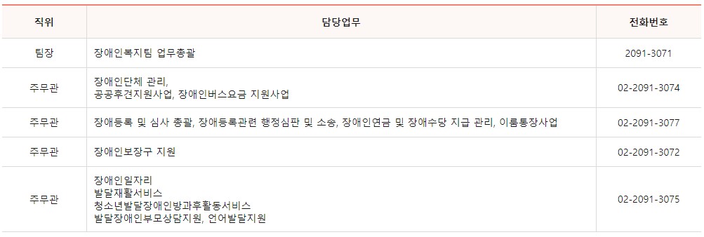 장애인복지팀 업무에 대한 민원이 필요하신 경우 담당자별 전화번호를 남겨드리니 쉽게 확인하시길 바랍니다.