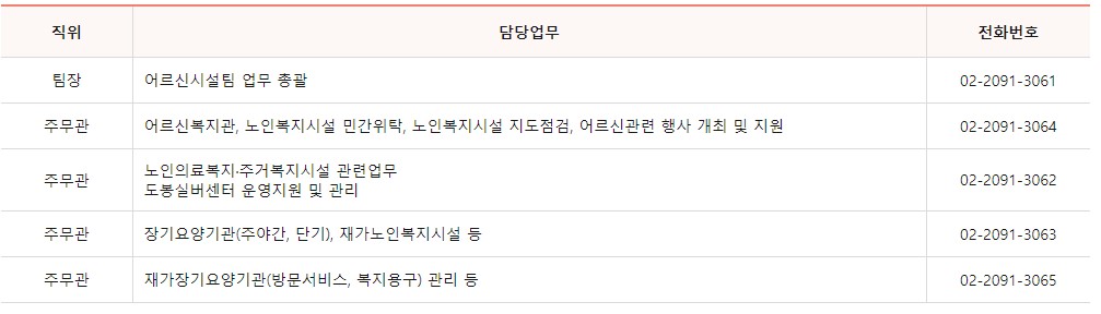 어르신시설팀 업무에 대한 민원이 필요하신 경우 담당자별 전화번호를 남겨드리니 쉽게 확인하시길 바랍니다.