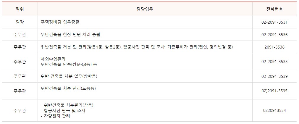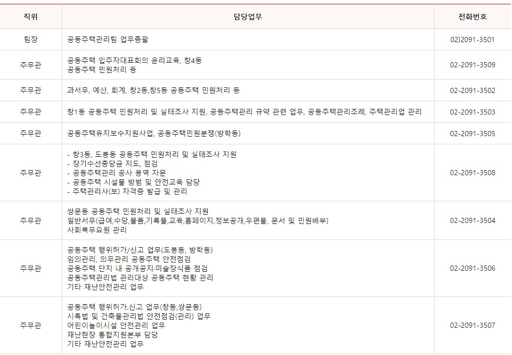 도봉구청 주택과는 3개의 팀으로 이루어져 나눠서 업무를 담당하고 있으며 각 팀별 업무내용과 전화번호를 아래에 안내 드립니다.