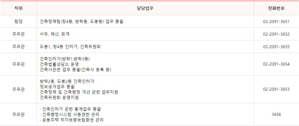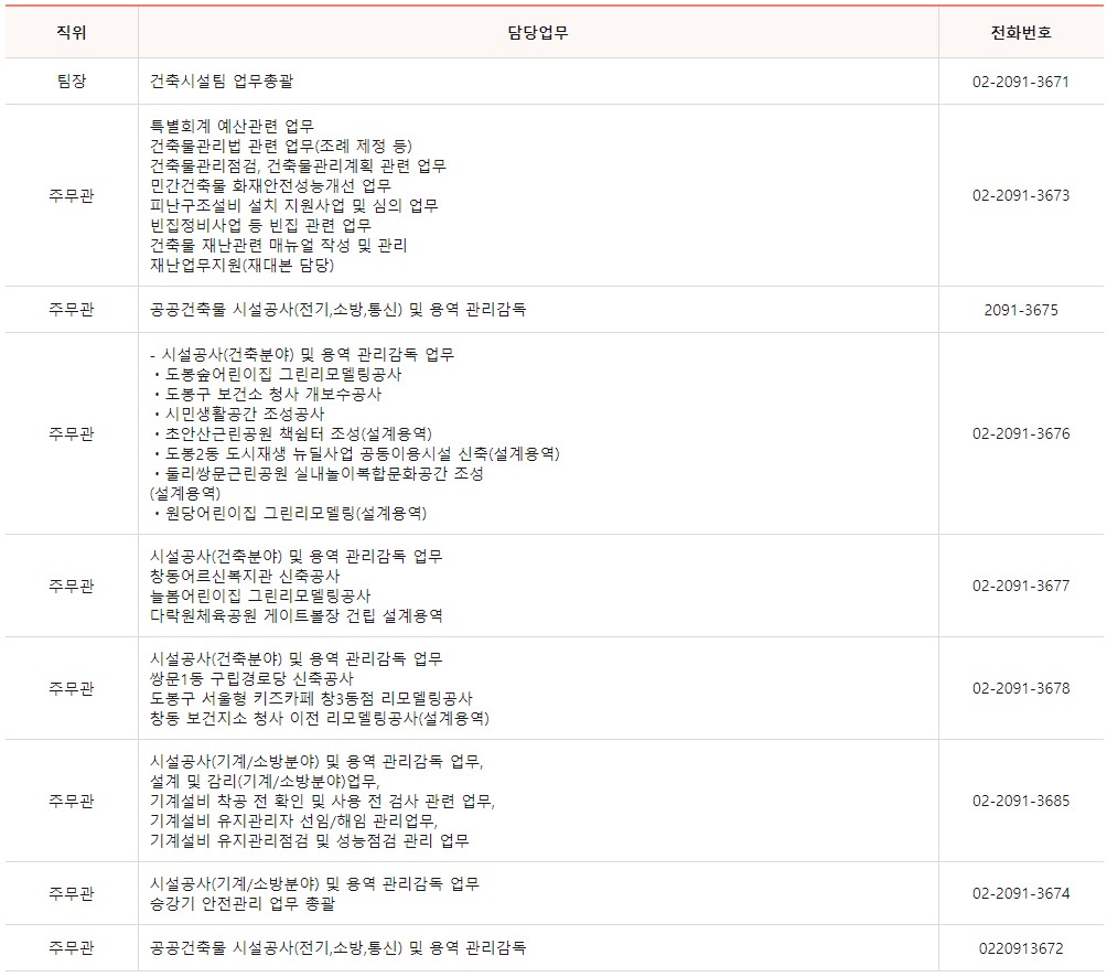 도봉구청 건축과는 5개의 팀으로 이루어져 나눠서 업무를 담당하고 있으며 각 팀별 업무내용과 전화번호를 아래에 안내 드립니다.