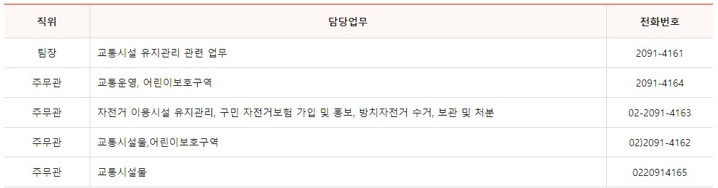 도봉구청 교통행정과는 5개의 팀으로 이루어져 나눠서 업무를 담당하고 있으며 각 팀별 업무내용과 전화번호를 아래에 안내 드립니다.