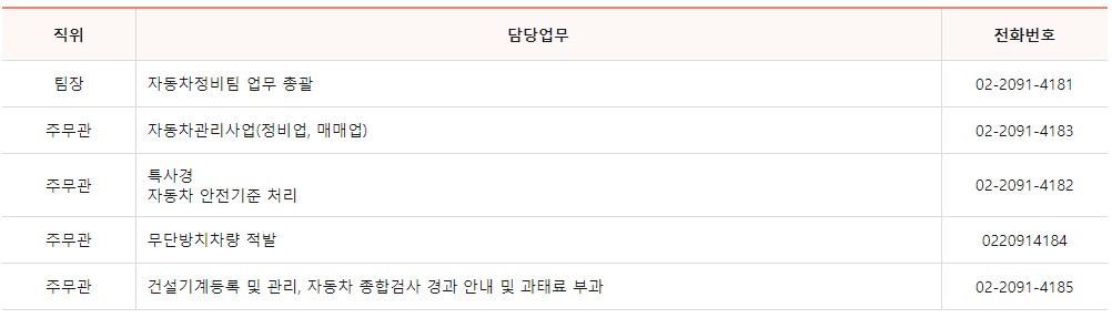 자동차정비팀 업무에 대한 민원이 필요하신 경우 담당자별 전화번호를 남겨드리니 쉽게 확인하시길 바랍니다.
