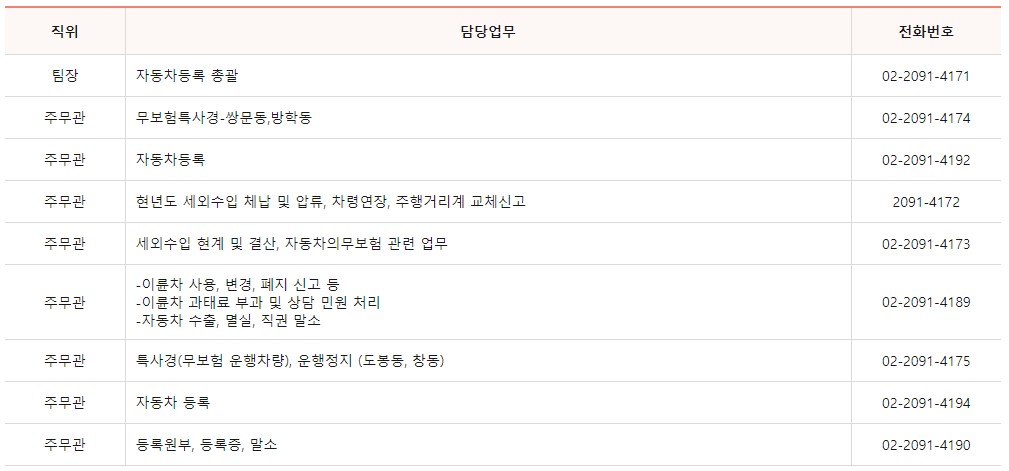 자동차등록팀 업무에 대한 민원이 필요하신 경우 담당자별 전화번호를 남겨드리니 쉽게 확인하시길 바랍니다.