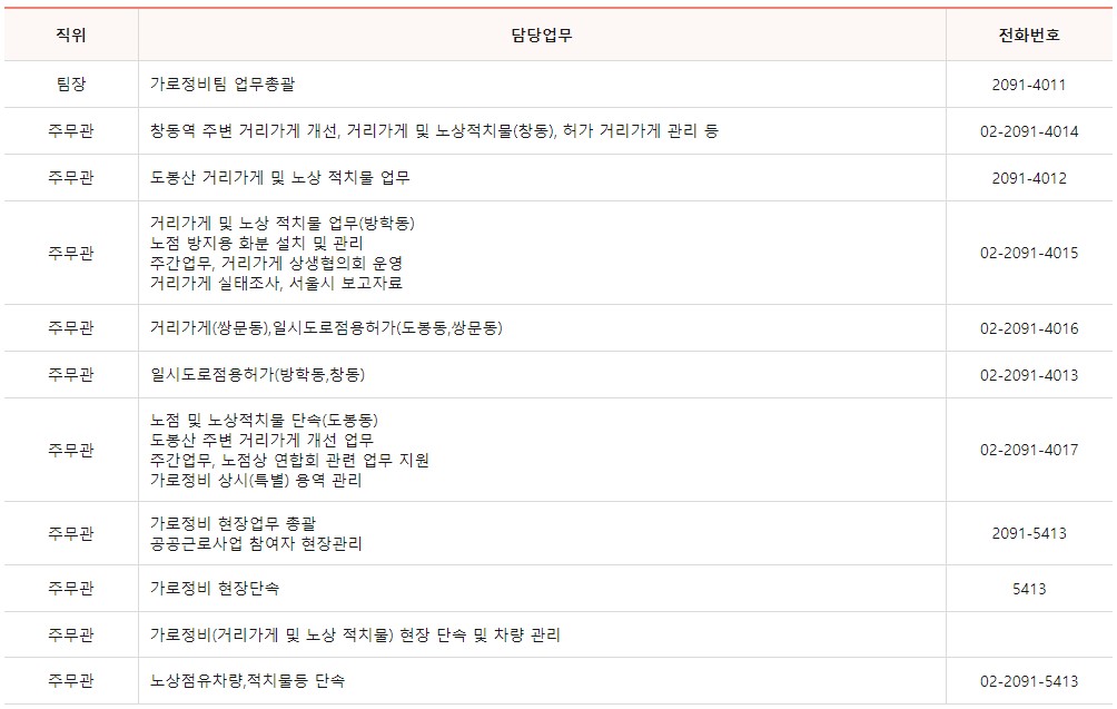 도봉구청 가로관리과는 3개의 팀으로 이루어져 나눠서 업무를 담당하고 있으며 각 팀별 업무내용과 전화번호를 아래에 안내 드립니다.